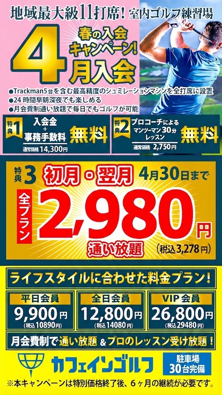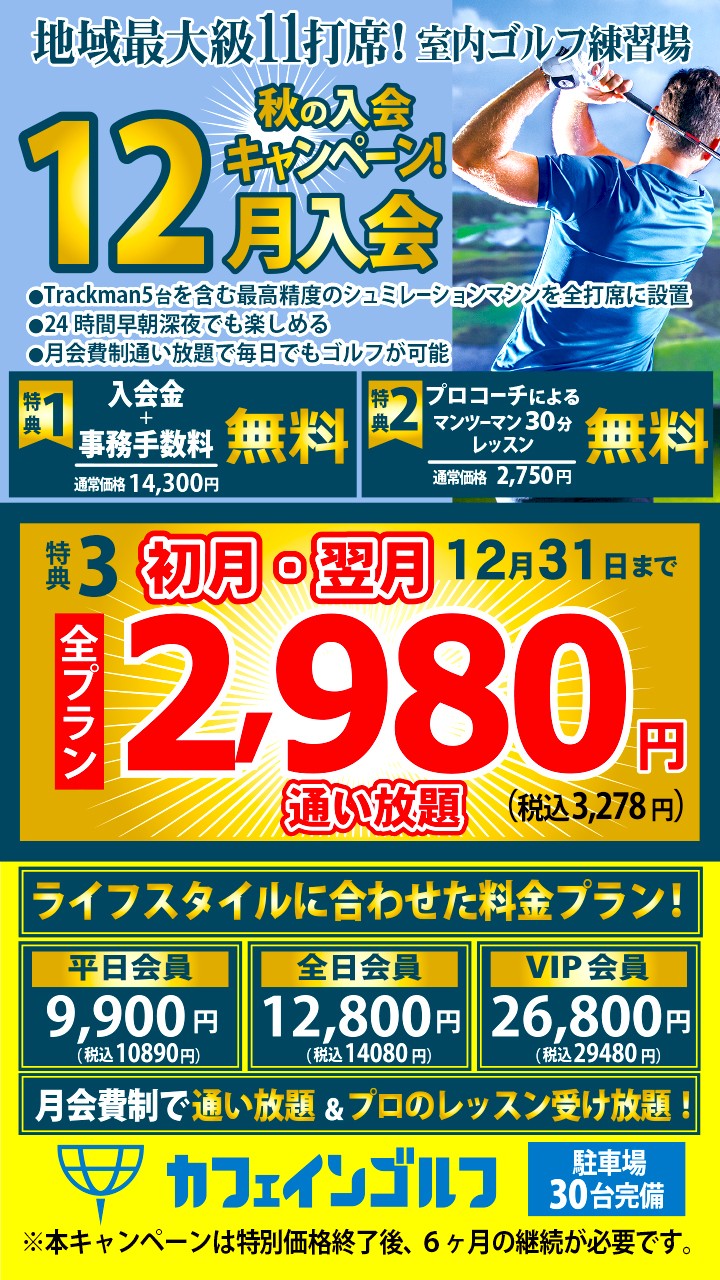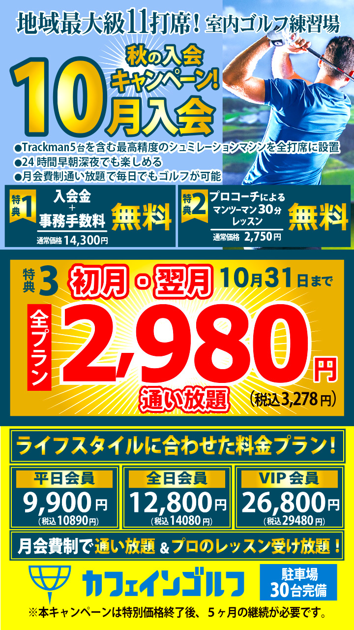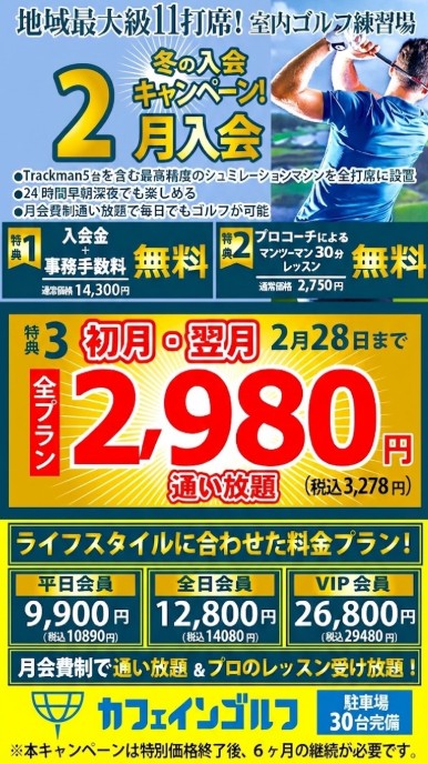 ゴルフは生涯楽しめる最高のスポーツであると同時に、上達により自信がつき、仕事上での会話が増え、人脈もひろがる仕事とプライベート両方が充実する最高のツールでもあります。 カフェインゴルフでは「効率よく上達したいけど、コーチにがっつり指導されるのは苦手」そんな方に特におすすめの施設です! 数値に基づいた最新シミュレーターを使ったセルフ練習×欲しいときだけピンポイントに受けられるプロのワンポイントレッスンを活用し、効率的にスコアアップし、ゴルフを味わい尽くしましょう!